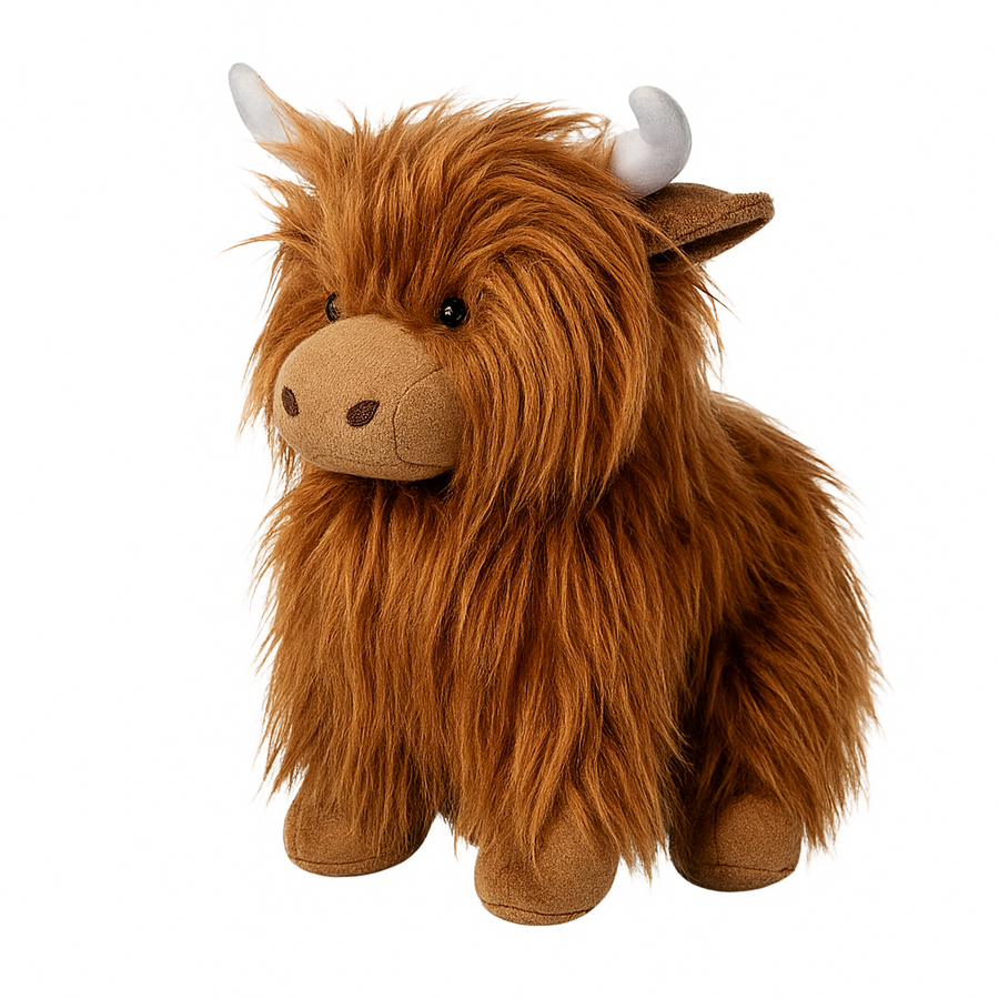 With his wild tousled coat and gentle eyes, Mac the Highland Cow is a cuddly companion full of charm and character. Inspired by the rugged highlands, Mac is made from luxuriously soft fabric perfect for snuggles and playtime adventures. His soft horns and fluffy fringe make him a standout friend in any nursery or toy collection. Whether he's off on a farmyard quest or simply relaxing at home, Mac is always ready to bring comfort and smiles.